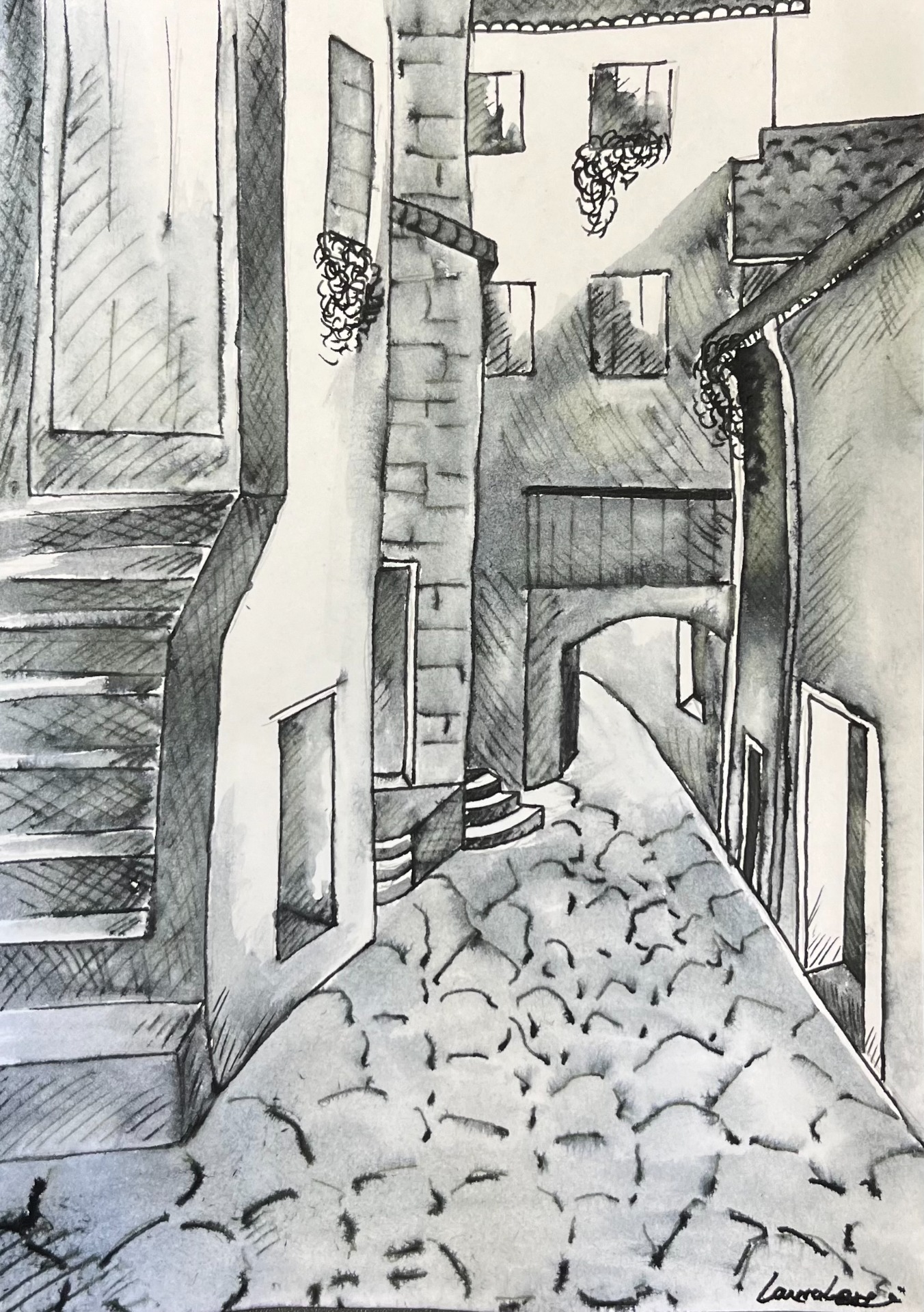 Neste trabalho o objetivo era desenhar uma paisagem em perspetiva e depois fazer um tratamento com grafismos e aguada.