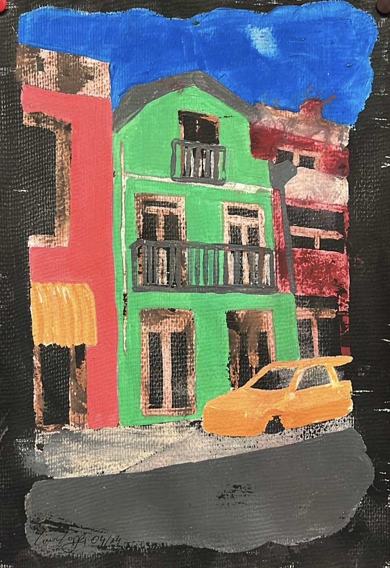 Neste trabalho tínhamos de desenhar uma rua da marinha grande do trabalho anterior em perspetiva e pintar com guache deixando alguns espaços em branco para depois passarmos com tinta da china por cima.